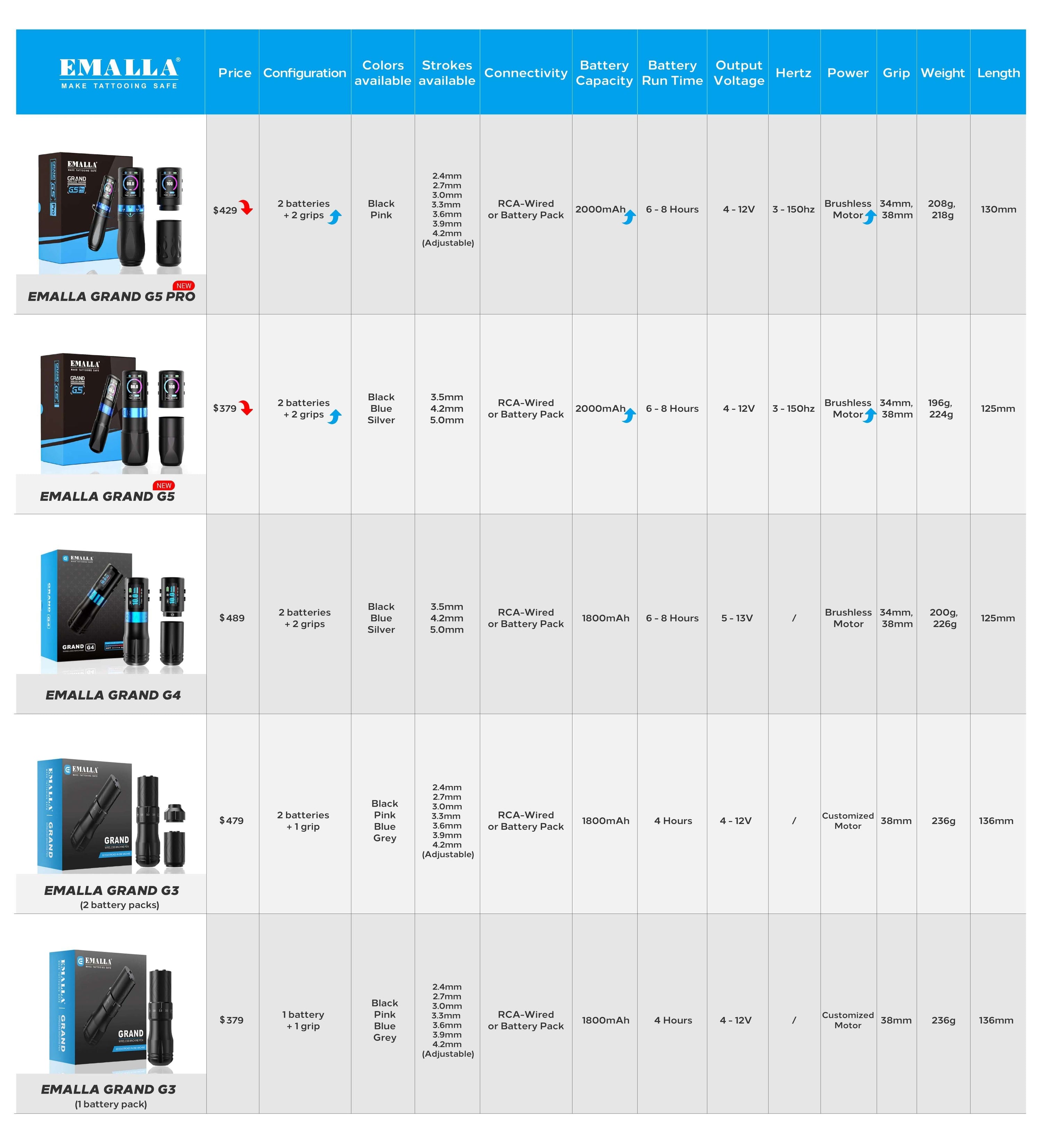 - THREE STROKES SELECTION - There are 3 strokes types of EMALLA GRAND G4 Wireless Tattoo Pen Machine: 3.5 mm, 4.2mm and 5.0mm. Artists could choose favorite stroke type to meet their tattoo style.